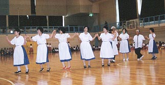 2曲目はルースニショゴフ。この曲は山梨県では知られていないので、正にウケ狙い。人数が少ないことも列の動きでカバー出来ましたし、拍手が入るせいかメンバーもノリノリ。1曲目の緊張もすっかりほぐれ、いつも通り楽しく踊れました。他サークルの方々にも、狙い通りウケてホッとしました(^^)。 |