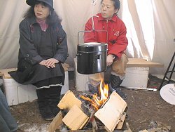 ワンサポナタイムさんのお庭にはテントがあるんですよ。(西部劇にでてくるインディアンのテントって言えば分かりますか?)テントの中でお昼用の玄米ご飯を飯ごうで炊きます。キャンプみたいで楽しそう♪ |