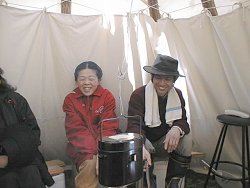 「もなさん」も到着、テントの仲間入りです。「そうこさん」どうしたの?煙が目にしみたのでしょうか。 |