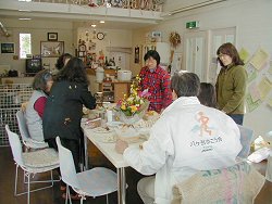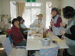 みんな揃ったのでお昼の準備をしているところです。Pさんは午前中八ヶ岳歩こう会の打ち合わせだったのでしょうか?(歩こう会のジャンパーを着ていたので・・) どんなお料理だったか知りたいでしょ?お料理は次のページに載せております。 |
