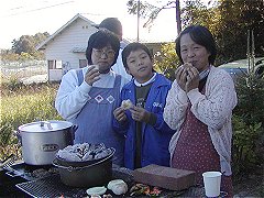 こんがり焼けた熱々のお握りを頂きます。香ばしくて美味しいようです。今日は、P・チップトップのお子さん◯君もお母さん(左)と一緒に参加してくれました。愉しんでくれたのでしょうか? |