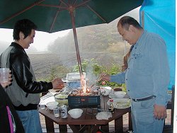 その頃外では火おこしをしている健気な男性一名!空気入れで火をおこしていましたよ!「僕は下僕で〜〜す。」何と明るい下僕ちゃんなんでしょう(笑)。 |