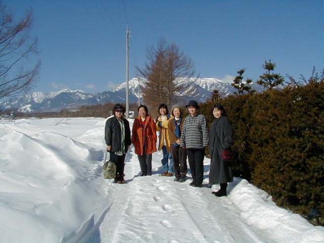 第二回やつねっとレディース・オフ会は小諸へドライブを楽しみ、お奨めのお店でお昼を食べる美味しい旅です。案内役のミントさん(森のファミリーママ)が来られる前に八ヶ岳をバックに記念写真を撮りました。クリックすると写真が大きくなります。「やつねっとカフェのハンドルネーム」左から梟マムさん、mayumiさん、たまさん、(チップトップママ)ハンドルネーム?(ワンサポナタイムママ)ハンドルネーム?(ピーベリーママ)チャルきらママ(MMistママ)写真係のZOOMママです。 |