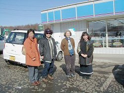 待ち合わせのローソンです。まずはご挨拶「今日は宜しくお願いいたします。」「こちらこそ・・・。」一番右側が今日の案内役ミントさん(森のファミリーママ)カフェにはもう少しお待ち下さい。気さくな、とってもいい方です。スキー場にも近いのでお泊まりしてあげて下さいネ! |