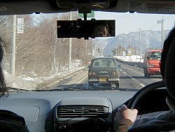 車が二台になりました。ミントさんの車が先導してくれます。助手席には梟マムさん作成の「あみだくじラッキーガールのチャルきらママ」です。今日はお天気に恵まれドライブ日和で暖房もいりません、あまりの暖かさに窓を開けてしまいました。(笑) |