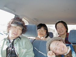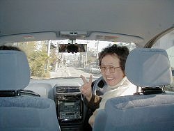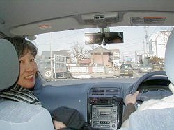 私の隣は怖いもの知らずのピーベリーママさん、何たって助手席は見通しがいいけれど事故の時には怖い場所です。(汗)それでもやはり嬉しそうなお顔です。遊びに出掛けるときは誰でも笑顔になりますよね〜〜。 |