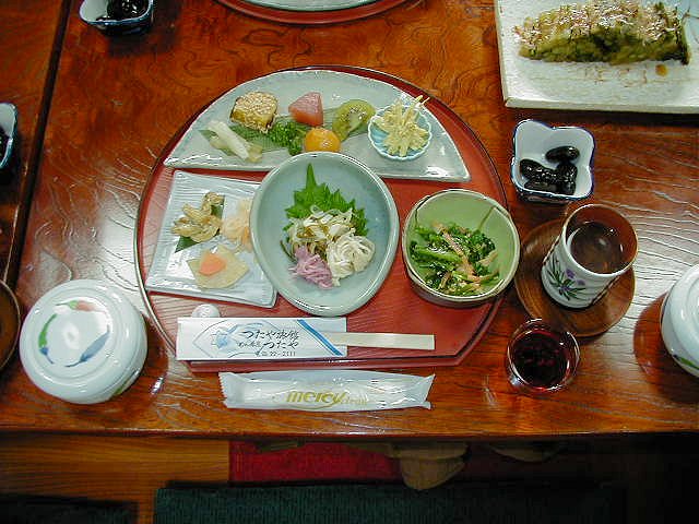 今日の付きだしはもう食べてしまいました。これはその次に出てきましたお料理です。心のこもった手作りのお料理に舌鼓・・・全部きれいに頂きました。シソの果実酒も美味しかったですね。写真をクリックすると大きくなります。 |