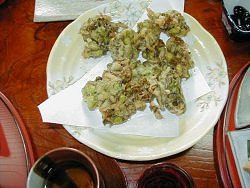 揚げたて天ぷら、野沢菜と枝豆で少し塩味が付いていて、とても美味しい一品、この天ぷらは人数より4つ多かったので○○○Mママ、○マム、○ayumi、た○、の四人が食べました。ご馳走様、早い者勝ち弱肉強食グループ、やつねっとレディースでした。 |