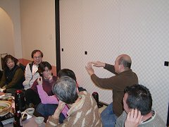 | 今年もやつねっと忘年会が、大泉村の「やまぼうし」さんにて楽しく行われました。乾杯の後は参加者の自己紹介、KANちゃんの表彰式、岡ちゃんの八ヶ岳移住後の仕事がマッサージ師と言うことなので皆さんがモニターになりました。宴もたけなわの頃、KANちゃんから面白い遊びの紹介があり大笑い、やつねっとのメンバーは何でこんなに愉快な方が多いのでしょうね、今から来年の忘年会が楽しみになっています。これでは鬼に笑われても仕方ないかも? |