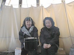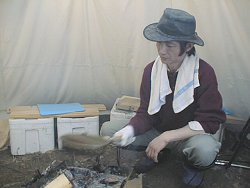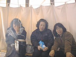 「もなさん」も到着、テントの仲間入りです。「そうこさん」どうしたの?煙が目にしみたのでしょうか。 |