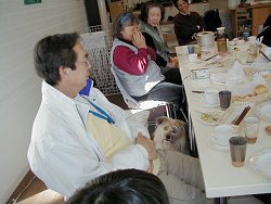 お子さんが増え、Pさんは主賓席から一般席に移動です。でも、話はどんどん盛り上がり楽しいオフ会になったのです。 皆さん、テーブルの下をご覧下さい、ムゥ〜ちゃんがお強請りしています。 |