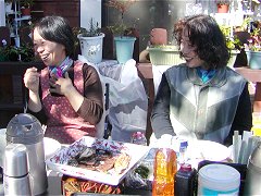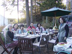 日が陰り、外の気温が大分下がりました。この後はお家の中に入らせて頂きお茶とお菓子で楽しい時間を過ごさせて頂きました。本日場所を提供して下さったご夫妻に感謝、有り難うございました。左から、お隣のカリスマ美容師のお姉さん・清里スタジオの奥様・P・ペアハットのお子さん・ろんちーさんの奥様・ペアハットママ・梟マムさん・ここに写っていないけれど他、熱々のお握りを食べていた3名・もう一人お子様・私、合計17名での楽しいバーベキューでした。 |