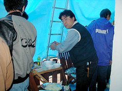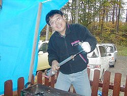 その頃外では火おこしをしている健気な男性一名!空気入れで火をおこしていましたよ!「僕は下僕で〜〜す。」何と明るい下僕ちゃんなんでしょう(笑)。 |