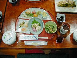 今日の付きだしはもう食べてしまいました。これはその次に出てきましたお料理です。心のこもった手作りのお料理に舌鼓・・・全部きれいに頂きました。シソの果実酒も美味しかったですね。写真をクリックすると大きくなります。 |