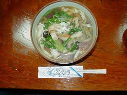 私が頼んだ「温かい手打ちうどん」です。お野菜、キノコがたくさん入っていました。手打ちなので歯ごたえ十分、おつゆまでは無理でしたが、きれいに頂きました。もうお腹はポンポコリン!最後は少しきつかったけれど頑張って食べました満腹、満腹。 |