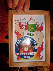 | やつねっと代表・清水氏から表彰されました。「やつねっとオブイヤー」我らがKANちゃん! | ||