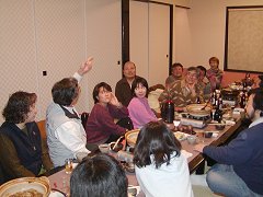 | 今年もやつねっと忘年会が、大泉村の「やまぼうし」さんにて楽しく行われました。乾杯の後は参加者の自己紹介、KANちゃんの表彰式、岡ちゃんの八ヶ岳移住後の仕事がマッサージ師と言うことなので皆さんがモニターになりました。宴もたけなわの頃、KANちゃんから面白い遊びの紹介があり大笑い、やつねっとのメンバーは何でこんなに愉快な方が多いのでしょうね、今から来年の忘年会が楽しみになっています。これでは鬼に笑われても仕方ないかも? |